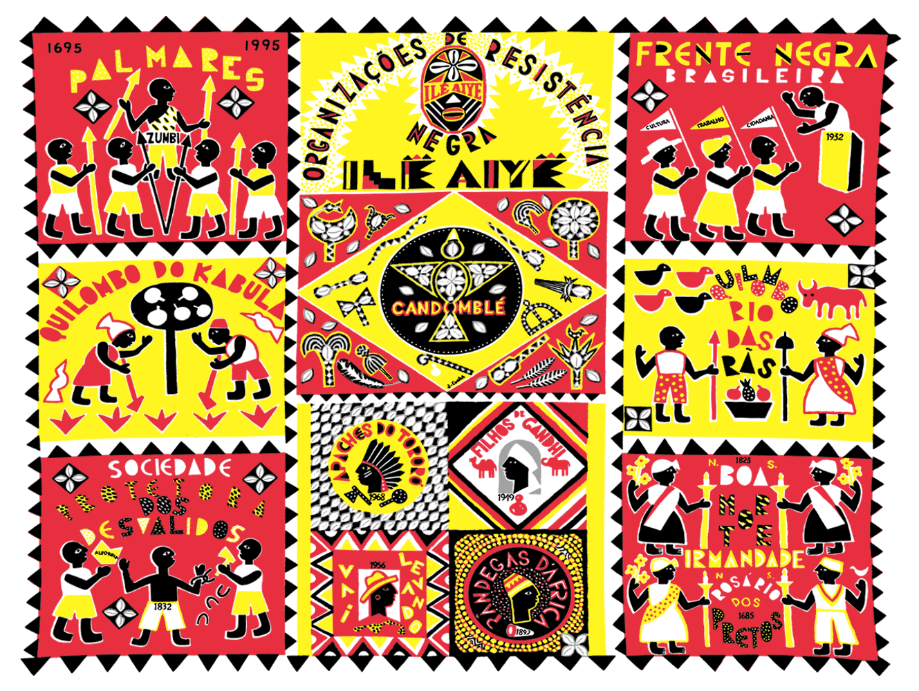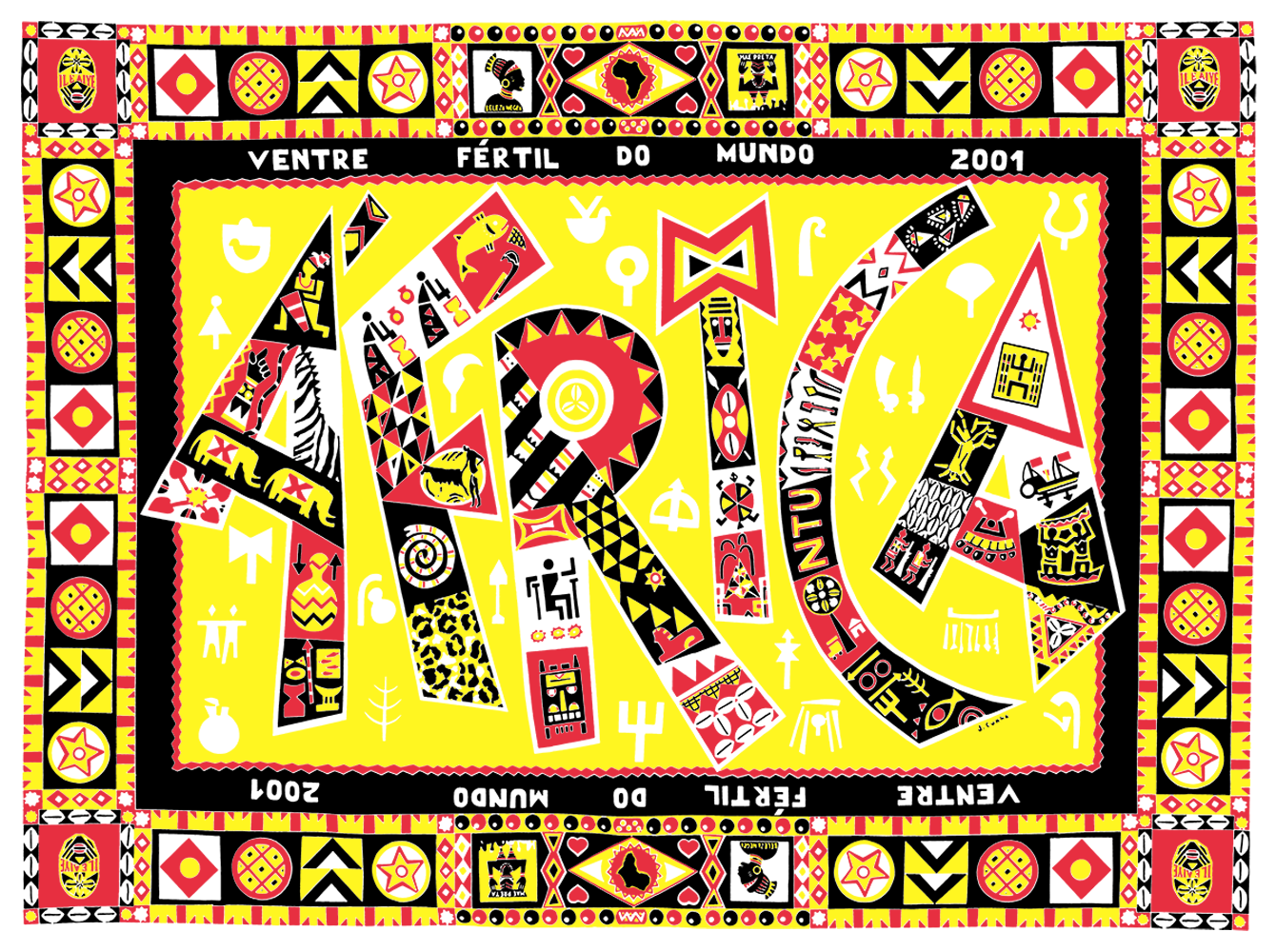 A produção artística reflete uma profunda compreensão e aplicação dos princípios discutidos por Frutiger em “Sinais e Símbolos.” A partir de tais princípios, J. Cunha utilizou símbolos e cores de maneira a comunicar a identidade cultural e a herança afro-brasileira de forma clara e impactante. Frutiger destaca a importância da simplicidade e da clareza na criação de signos eficazes. Para ele, a eficácia de desse tipo de imagem reside em sua capacidade de ser imediatamente reconhecível e compreensível, independente do contexto cultural do observador.